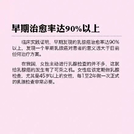 在最早谈到乳腺癌话题,号召大家“关爱乳房”的时候,媒体曾一度大力号召女性做乳腺自检,以便及早发现、及早治疗。然而事实上,大量实验数据证实,乳腺自检其实并没能减少乳腺癌的死亡率。这个结论有些令人灰心,但也进一步说明了,自检固然重要,但定期去医院找专科大夫体检是更加、更加重要性的。