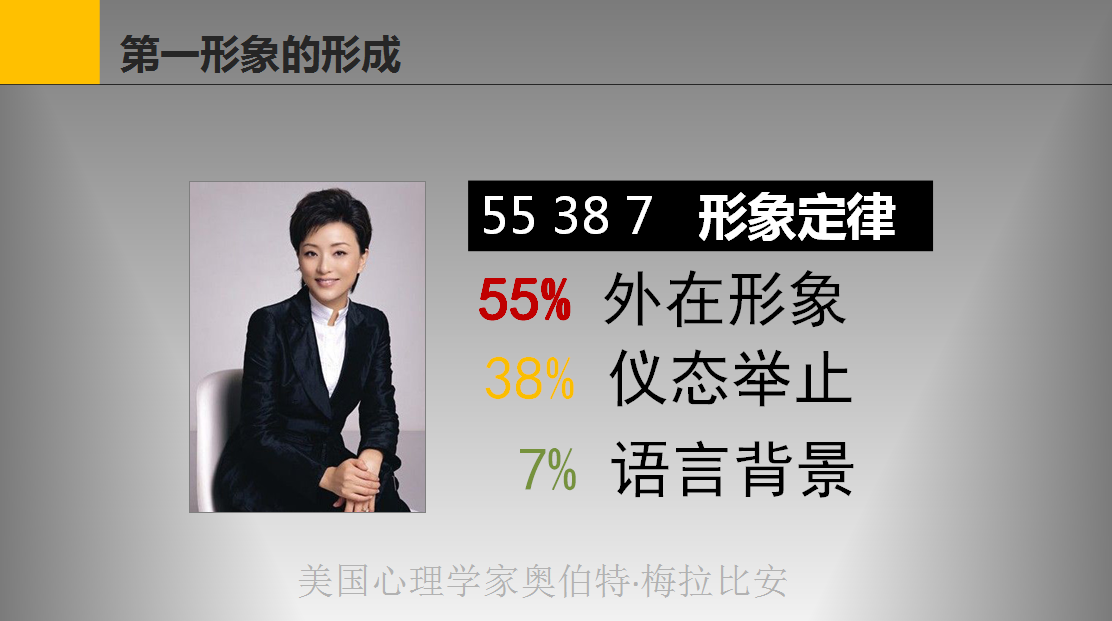 想知道第一次见面的人,通过什么方式了解你?个人行为给人的印象只有7%取决于语言沟通、38%取决于音质,而高达55%的因素是行为礼仪。可见能说会道的人远远不及礼貌周全的人赢得人气。