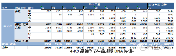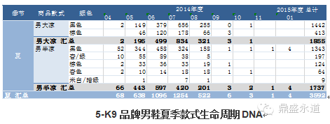 根据K9品牌2015年规划,男大凉品类的总销售周期是4月-9月,而男半凉品类的总销售周期是4月-8月,由各部门精英组成的‘审版小组’要逐款商品评估高峰销售月,大凉要找到6、7月好卖的中心款,半凉要找出5、6月好卖的中心款,那些没有显著特点的产品会被定义为非中心产品。