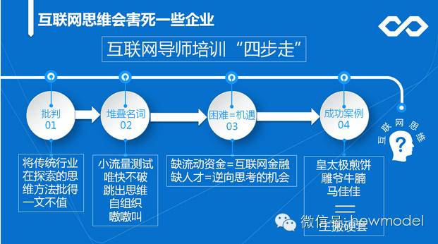他们把我当成了社会上的一类人:互联网导师、互联网教练以及互联网概念投资人。他们有一套通用的做法,我罗列了四条:首先是批评,不管这个企业在摸索过程中的具体逻辑是怎么样的,先批评这个企业做得不互联网;其次是堆砌一些名词,比如唯快不破、跳出性的思维、降纬打击、自组织、嗷嗷叫,到现在都没明白是什么意思。