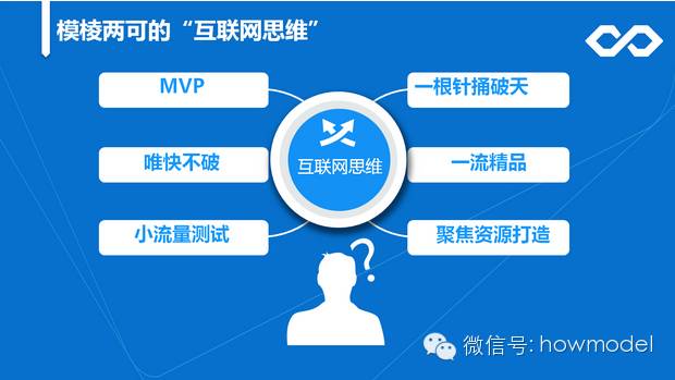 “什么是互联网思维?是不是可以形成一套放之四海皆准的逻辑思维体系,只要照着做就能完成向互联网+的过渡?答案显然是否定的。因为有很多互联网名词本身就是矛盾的,比如有一个名词叫‘一根针捅破天’,就是在针尖的地方布重兵,把这个事做到极致,而另一个名词‘MVP’的意思是小投入快速方式,这两种做法都各自具有代表性的成功案例,你很难说哪一种做法才是正确的做法。