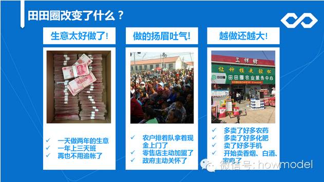 “田田圈改变了什么?零售店老板说‘以前一年365天待在店里天天等着客户上门,最后收不到现金我还要追账,现在不用追账了,一天就能做两年的业绩,一年只需要上三天班’。”