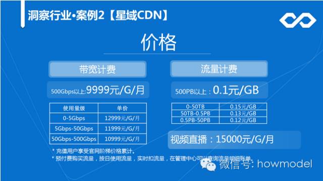 “这是我们的价格体系,2015年3月我在亚太CDN大会上说CDN的价格应该腰斩之后,降到的最低价格是2毛5,我们的价格是1毛。”