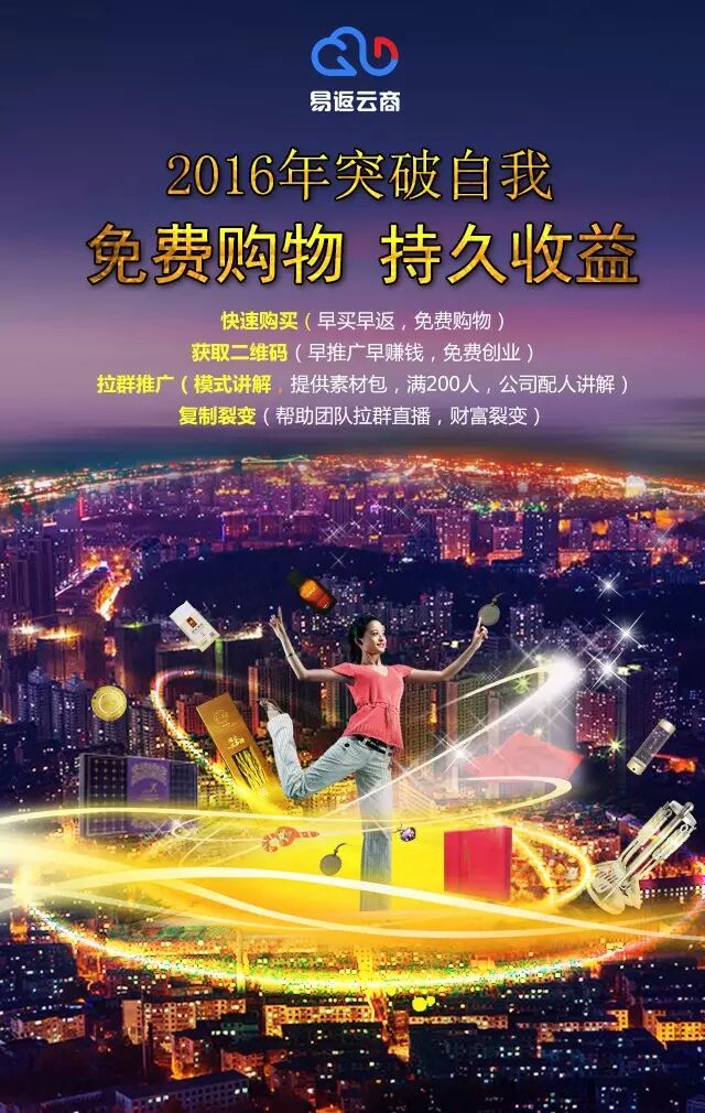 我们坚信易返云商会发展越来越好,我们希望更多志同道合的人,一起为拉动中国内需,实现伟大的中国梦做点事。2016,让我们“连接微力量,成就大梦想”,一起引爆移动端,共创、共享、共赢!