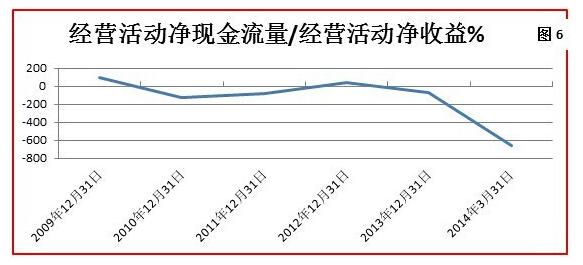 房地产行业格局趋冷,其现金流也在不断恶化。事实上,自2009年以来,房地产企业整体的现金流状况就不容乐观。根据WIND统计数据,自2009年以来,房地产企业的经营活动现金流量净额占经营活动净收益的比重由原来的93.68%迅速下降到2013年末的-75.74%,2014年一季度更是恶化到-663.31%【图6】。经营活动现金净流量占营业收入的比重,也由2009年的16.7%下降到-11.41%。