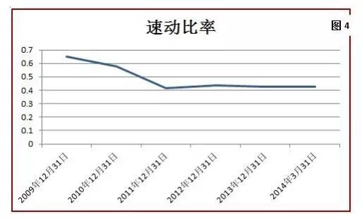 房地产企业的偿债压力正在逐步显现。以最能反映偿债能力的指标——速动比率为例,上市房地产企业2009年的速动比率达0.65,此后逐年下降,到2013年末,这一数据已经下降为0.43【图4】。