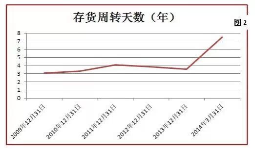 2009年房地产行业存货周转时间为3.06年每次,2013年末该数据延长至3.55年每次,2014年一季度迅速恶化为7.51年每次【图2】,这意味着房地产企业的每一元现金支付,需要长达7.51年的时间才能收回或者回笼成本。