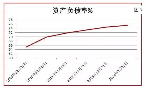 2009年,上市房地产企业的平均资产负债率为65.17%,到2013年末,这一数据迅速上升至74.56%的水平,2014年一季度末进一步升至75.43%(据WIND数据统计)【图3】。