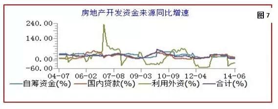 根据国家统计局数据,2014年1-6月,房地产开发企业到位资金58,913亿元,同比增长3.0%,增速比1-5月份回落0.6个百分点。其中,国内贷款11,293亿元,增长14.1%;利用外资186亿元,下降20.6%;自筹资金23,810亿元,增长10.1%;其他资金23,624亿元,下降7.2%。在其他资金中,定金及预收款14,252亿元,下降9.3%;个人按揭贷款6,512亿元,下降3.7%【图7】。