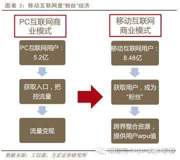 我们认为移动互联网和PC互联网相比最大的不同点在于商业模式调整。PC互联网的商业模式是通过入口级产品获取用户,把控网络流量,最后通过流量变现来获取盈利。移动互联网的商业模式是通过极致的产品和服务来获取用户,把用户变成自己的“粉丝”,然后通过跨界整合资源来为用户提供更好的用户体验,最终提高用户的arpu值。之所以会形成这样变化的原因在于: