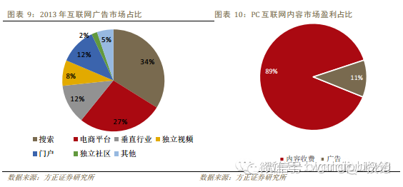 后端收费主要是广告模式,这种收费能力基于强大的流量导入能力以及具备广告合适的展示方式,目前主要应用在信息门户、在线视频领域。在线音乐和在线教育目前尚未找到盈利模式。我们认为移动互联网时代,受制于移动化、碎片化以及移动终端屏幕偏小的特征,广告效果会大幅减弱,盈利能力随之大幅降低,未来互联网内容盈利模式将以直接面向用户前端收费能力的网络游戏、在线直播秀场、在线教育等作为主要研究方向。