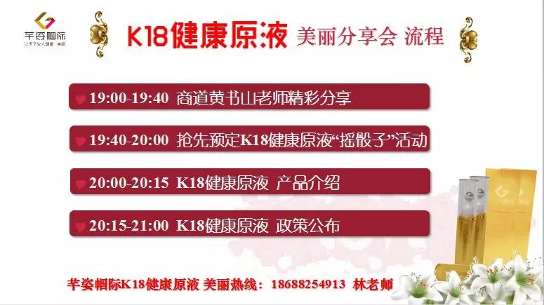「一直被模仿,从未被超越 」2015年10月28日晚19:00芊姿帼际K18健康原液美丽分享会圆满结束,本次会议上商道灵魂导师——黄老师做了精彩分享、抢先预定K18健康原液“摇骰子”活动、K18健康原液 产品介绍、同时公布“K18健康原液 政策公布”让我们一起精彩回顾~