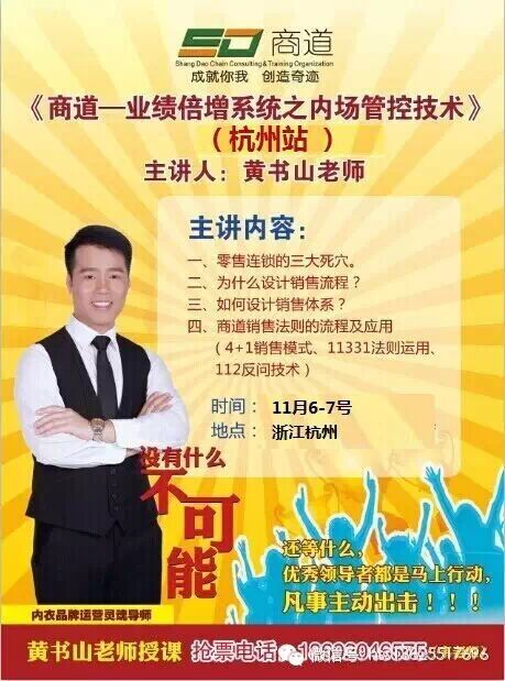 商道周年颂巡讲第三站-杭州站《商道业绩倍增之内场管控技术》期待您的参与!11月6-7号杭州站我们约定您!!