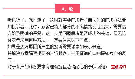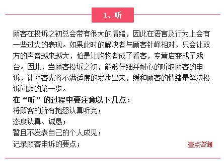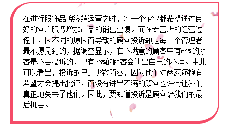 以上三种客户投诉类型是我们经常见到的客户投诉种类,有的店员或专营店管理者会因为客户的怒气而惧怕。以小编的经验而谈,客户投诉不仅仅是一个专营店危机公关处理能力的表现,同样也是一次提高服务严谨度、对企业及员工教育的一次机会。例如针对第三点投诉原因,有的专营店即在购物小票上标明部分面料产品的洗涤说明,不仅避免了顾客因自身原因而导致的产品损毁,也为自已省去了麻烦。
