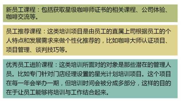 星巴克(中国)大学:这是星巴克中国在2012年11月推出的一个面向员工的企业大学培训平台。员工除了接受入职的相关培训之外,还可以报名入学,接受更加系统性的培训,为今后进一步提升做知识技能储备。像所有企业大学一样,他们提供的课程主要是: