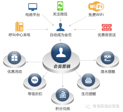 除了常规的会员生日提醒、潜水提醒、消费提醒、积分兑换以及优惠推送等会员营销方式,我们还可以实现让所有通过微信关注、呼叫中心来电、优惠券发送过的用户,都可以自动成为您的会员,从而全面整合您的目标客户,介入口碑营销