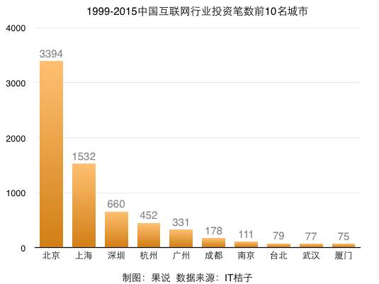 该段图片来源于知乎用户 @袁晓辉的回答,先来看下互联网行业投资笔数的城市排名: