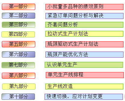 公开课成功与否取决于开头抓住学员课程需求和消除学员的陌生感。开课前我让每位学员自我介绍,介绍完后学员们相互认识并交流名片。慢慢的同学们很快进入课程的学习状态,两天的课程没怎么用课件的内容,所讲的内容主要是:生产计划、物料控制及产线优化三方面,即详细分布: