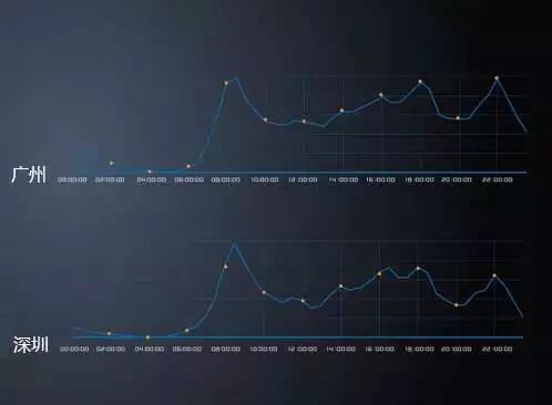 数据显示,上海只有上午9:00出现一次早高峰,没有晚高峰和夜高峰,也说明上海人比较享受生活,而非工作。广州和深圳的出行波峰走向非常一致,下午高峰和晚高峰峰值也基本相同。而在北京,一天中三次高峰非常明显,夜高峰的订单量远远高于早高峰和晚高峰,加班到深夜才回家的人是上班族的大多数。