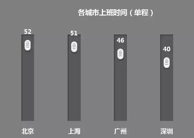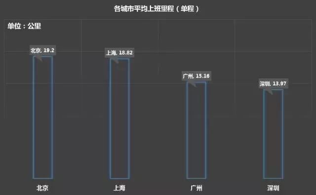 北京城市面积最大,人均上班里程也最长,为19.2公里;其次为上海18.82公里;广州和深圳平均就要短一些,分别为15.16公里和13.97公里。拿北京而言,翻山越岭中关村,望眼欲穿CBD都不算事,光是上班路上就得非常拼。