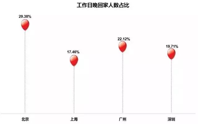 北上广深四个城市的上班族每天步履匆匆,繁忙的工作也在挤压着私人空间。四个城市中,北京人出行时间最长、加班时间最晚、加班范围最广、不能回家吃饭比例最高,各项指标都完胜上海、广州、深圳。