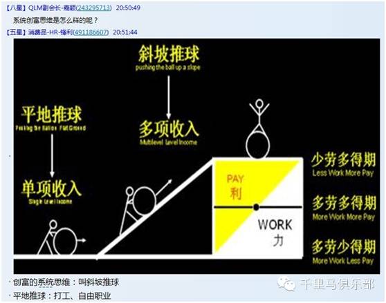 平地推球,相当于打工,无需花费太多的力气就能将球推动,但获得的是单项收入;而斜坡推球就好比创业,前期可能会非常辛苦,非常吃力,也不一定能把球推上去,但是只要坚持,加把劲,把球推上一个平台后,他们不仅站得更高,而且打造了一个赚钱的平台,平台打造成功,他们将获得演源源不断的长久性的收入。