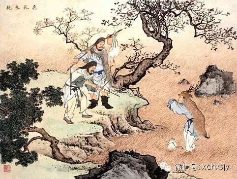 郯子,春秋时期人。父母年老,患眼疾,需饮鹿乳疗治。他便披鹿皮进入深山,钻进鹿群中,挤取鹿乳,供奉双亲。一次取乳时,看见猎人正要射杀一只麂鹿,郯子急忙掀起鹿皮现身走出,将挤取鹿乳为双亲医病的实情告知猎人,猎人敬他孝顺,以鹿乳相赠,护送他出山。