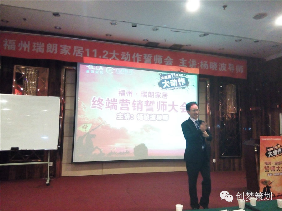 国家职业资格注册营销师、中国建材家居终端营销实战派专家、中国建材家居终端云营销高级导师,实战讲师杨晓波导师现场疯狂演讲,将福州瑞朗家居11月2日大动作活动誓师大会推向高潮!