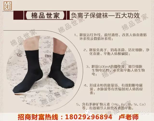 棉品世家的按摩保健袜蕴含着国际最尖端的技术结晶,尤其是将天然托码琳,磁石晶体通过高科技技术形成超微细的粉末,并融合成一体,利用接柱技术使之与天然织物纤维结合,充分改善人体末梢神经足部的微循环,活化足部组织细胞,突破了传统的以“吃”为主要保健途径的保健理论,真正实现了人们穿着保健的梦想,为世界所瞩目。