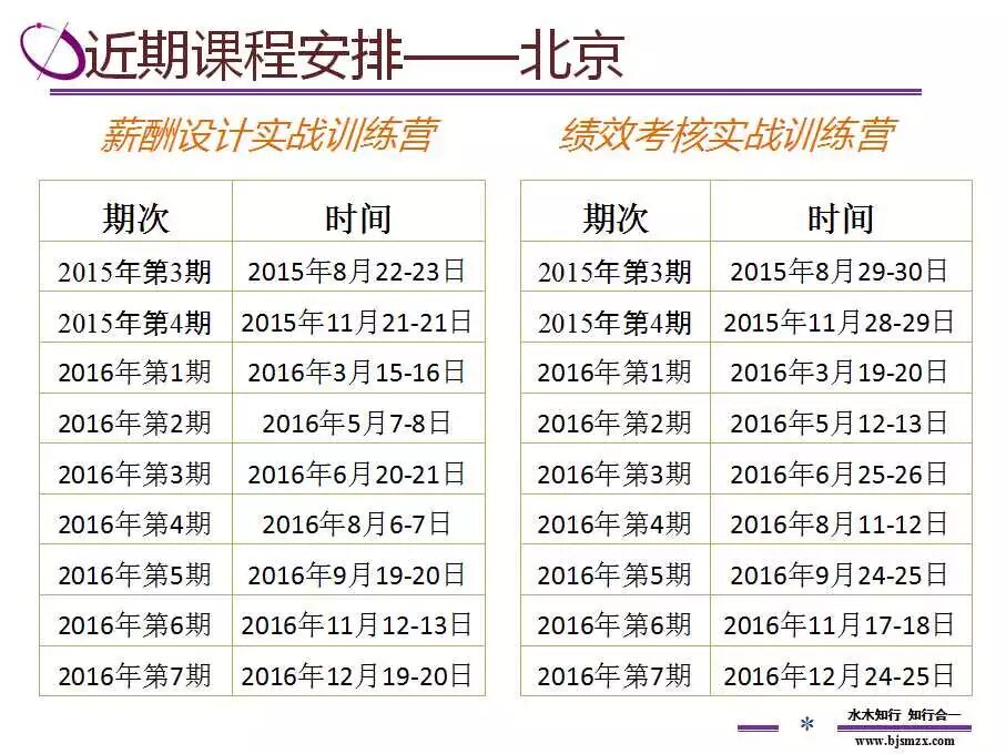 根据畅销书《薪酬设计与绩效考核全案》开发的水木知行薪酬设计实战训在北京定期开班,目前已经举办3期,学员来自工行、北汽、蒂森克虏伯、光大金控等大型国企、外企、民企以及众多中小型企业,培训的费用咨询的效果,敬请关注。